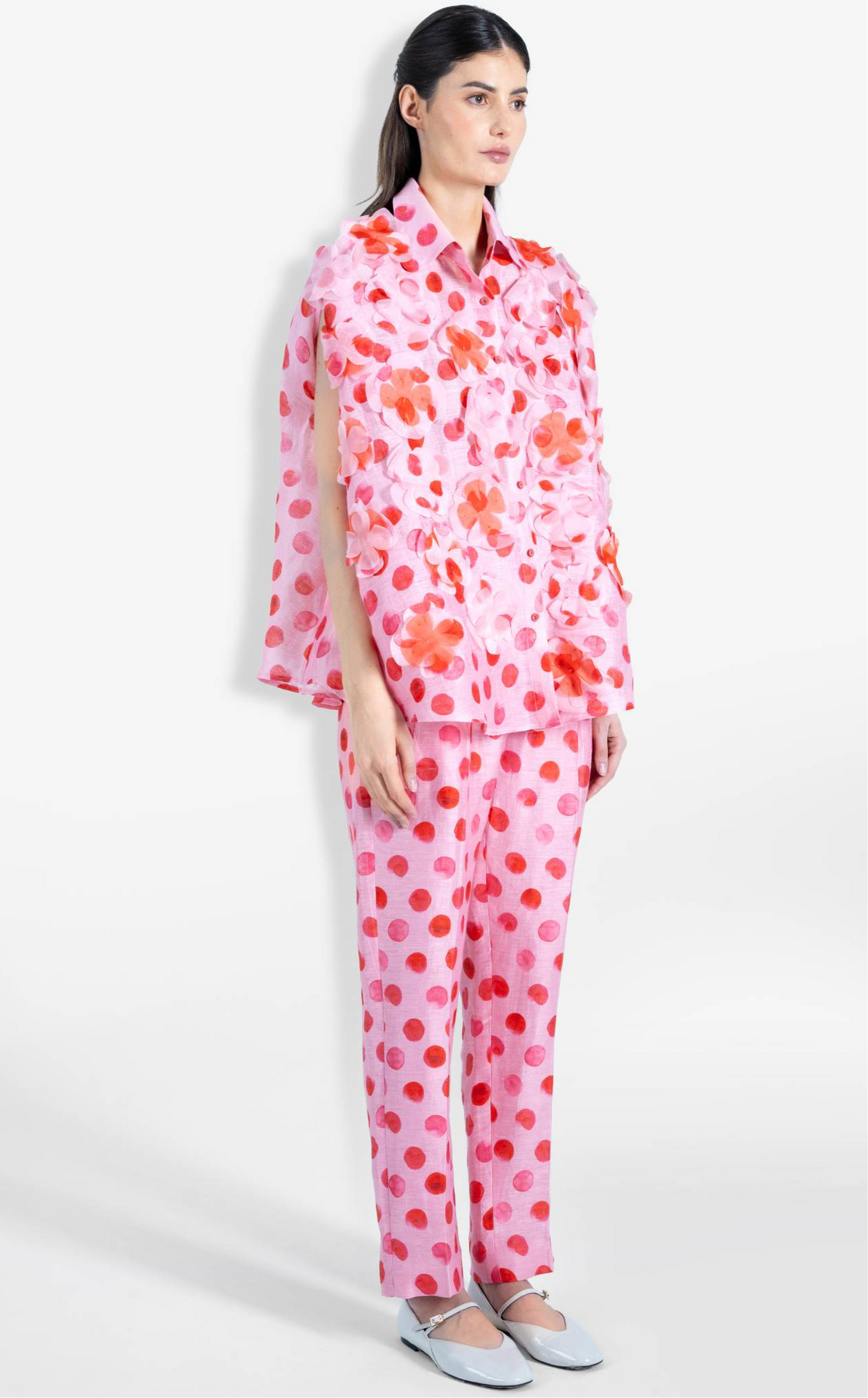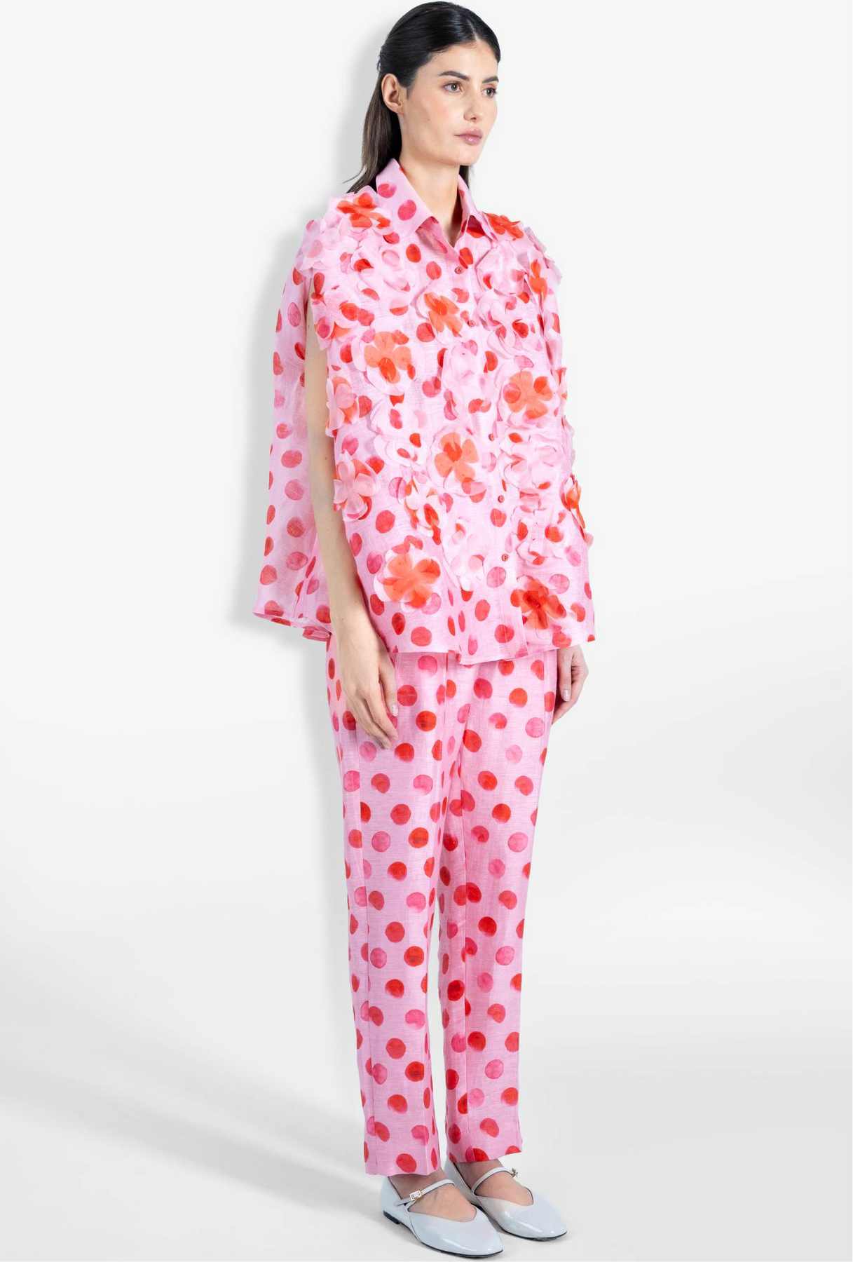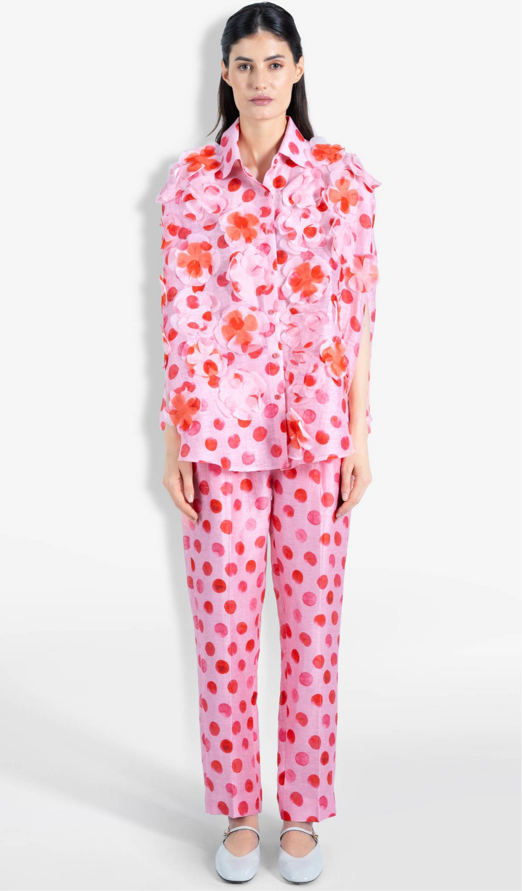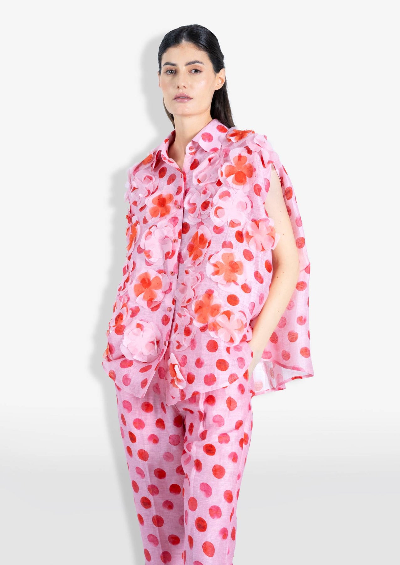 Button-down shirt crafted out of Linen silk, adorned with delicate flower appliques.