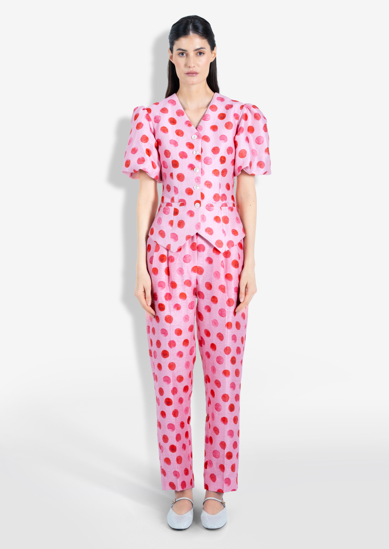 Vest is given a contemporary update with oversized, voluminous sleeves, adding a playful yet sophisticated touch. The sleek vest design pairs perfectly with the dramatic sleeves, making it a standout piece for any wardrobe.