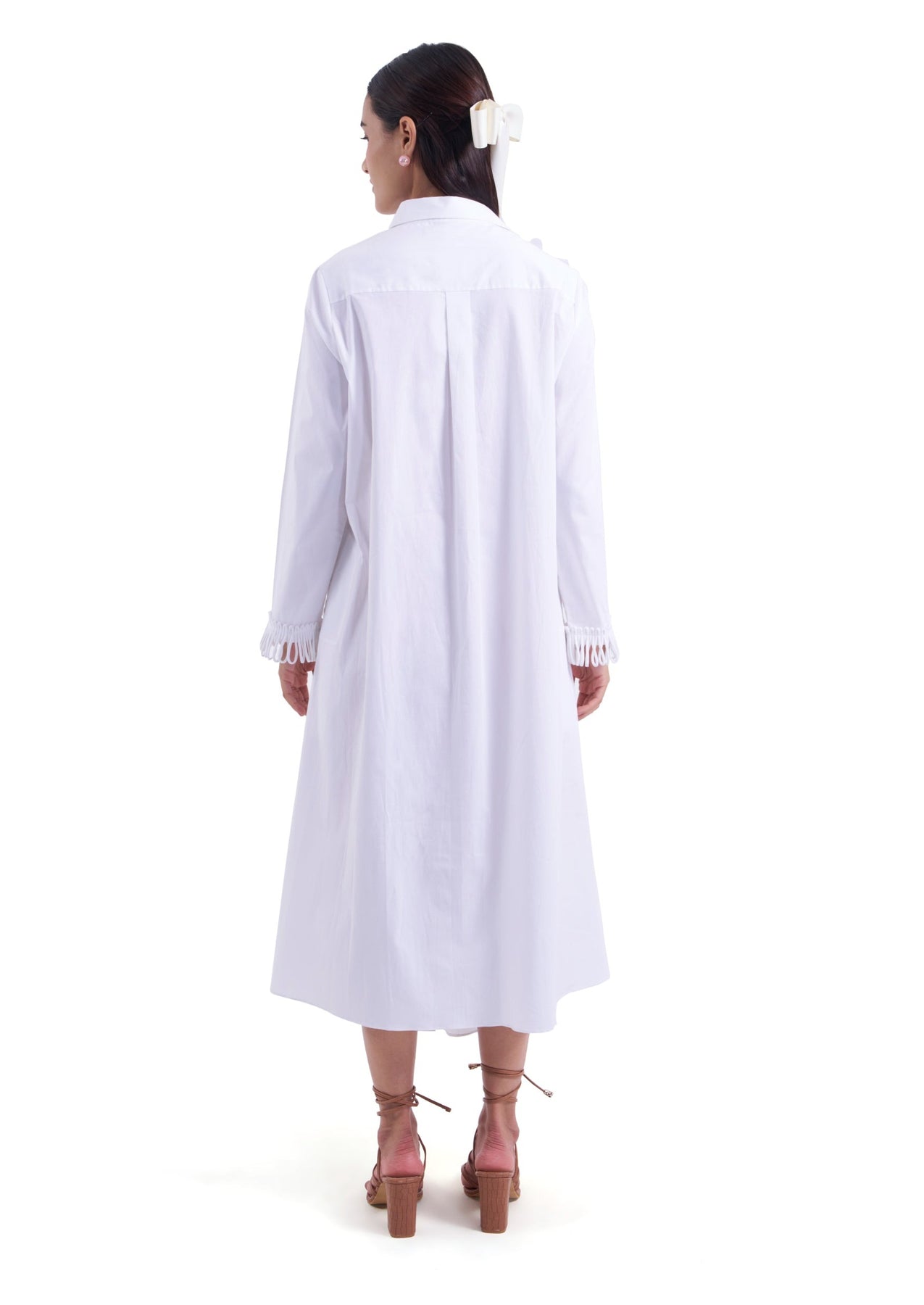 Mid-length, button-down shirt dress crafted out of cotton poplin. Flower appliques adorn the front bodice. Classic collar and full sleeves with loop details bring the entire look together.