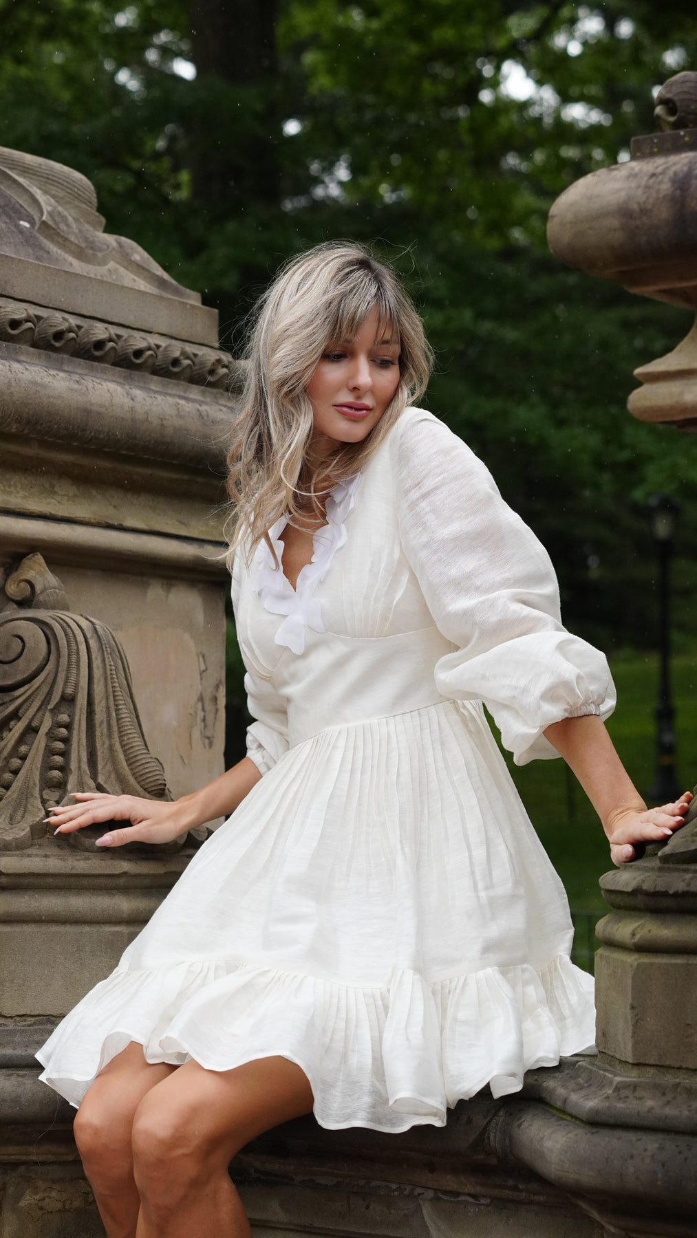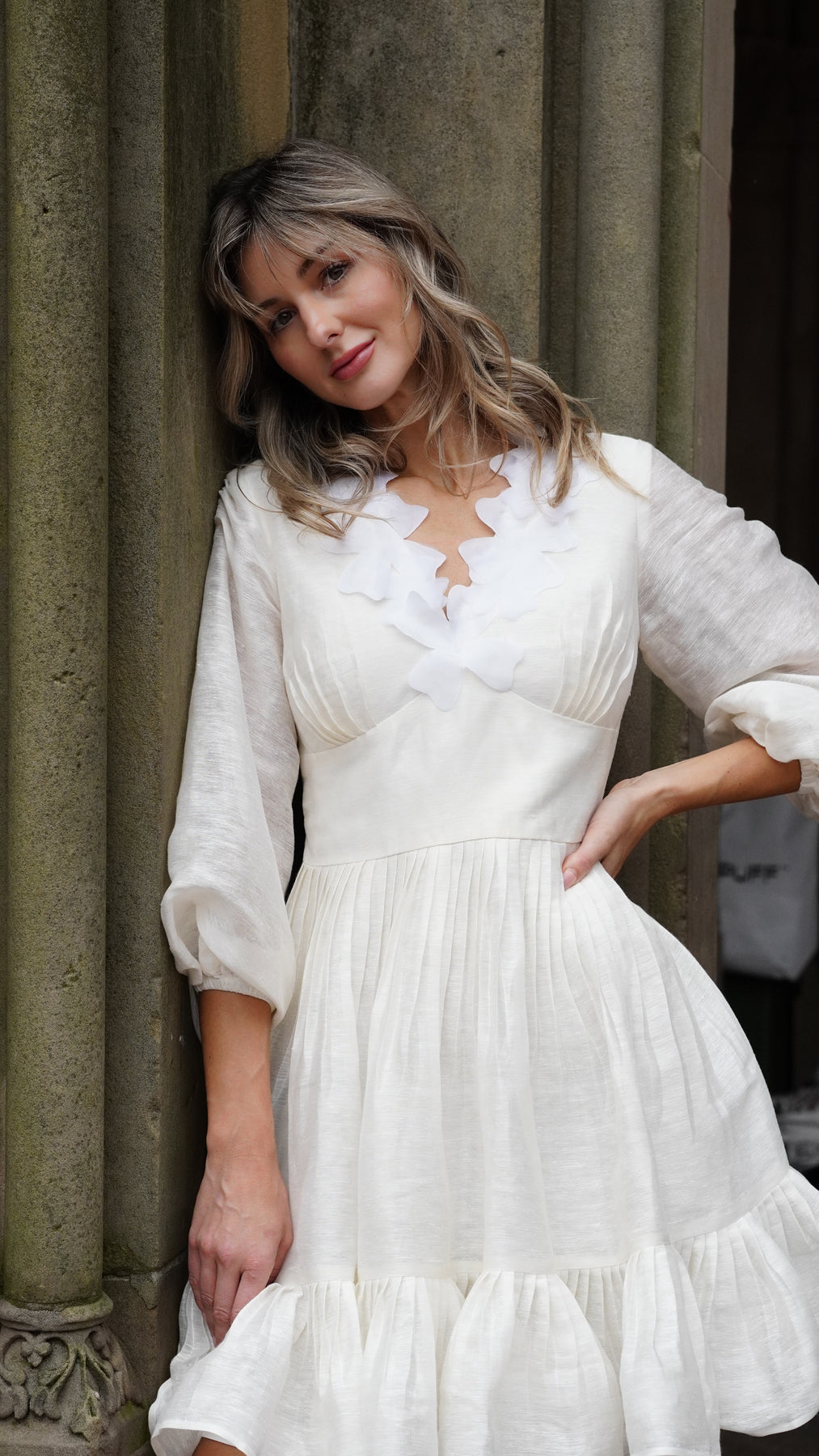 Mini dress is crafted in linen silk with dramatic sleeves, is adorned with delicate applique flowers.