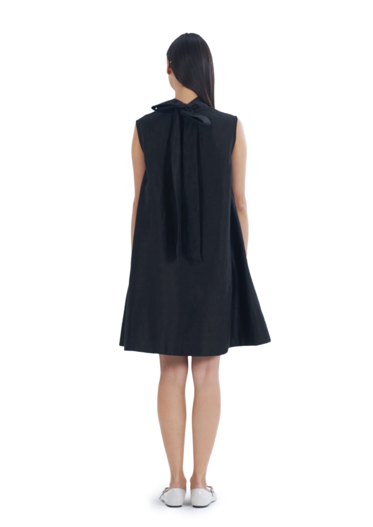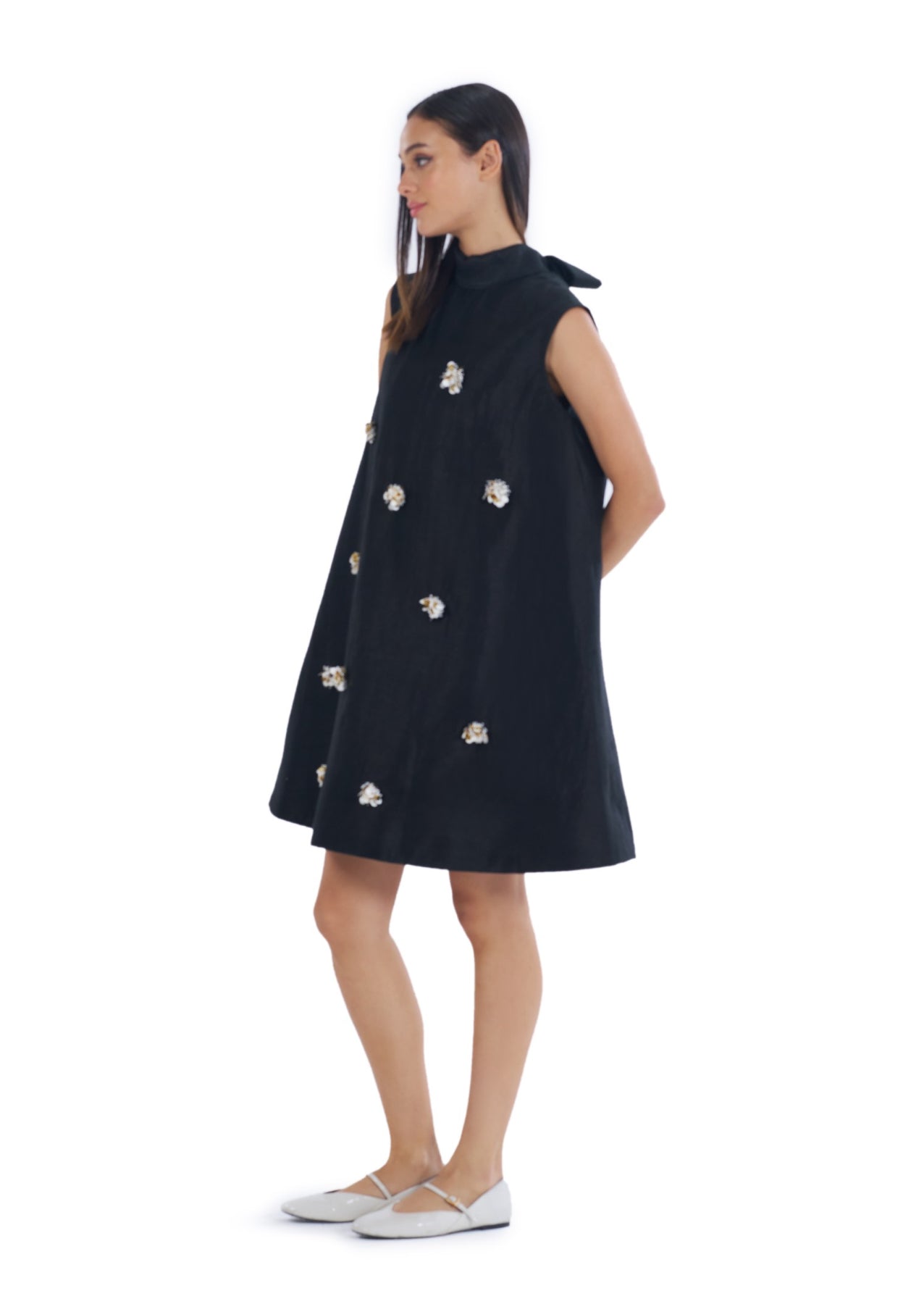 Flower mini dress features a flattering A-line silhouette with a charming back bow and delicate floral hand embroidery, adding an elegant, feminine touch. The thoughtful details combine whimsy and sophistication, creating a look that’s both fun and refined.