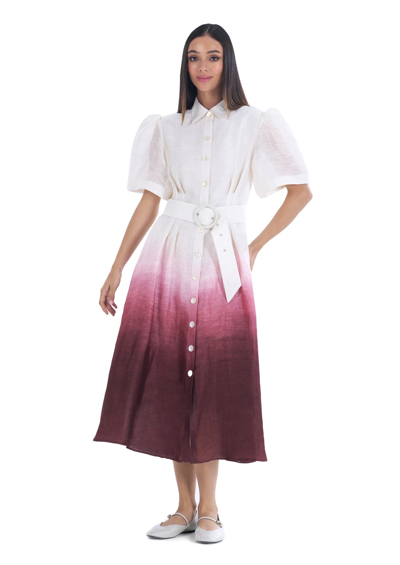 The button-front ombre shirt dress drapes gracefully, elongating your silhouette with effortless drama. Its shirt dress silhouette offers a relaxed fit through the bodice, ensuring comfort without sacrificing style. Dramatic puff sleeves add a touch of vintage-inspired romanticism, elevating the look with chic flair.