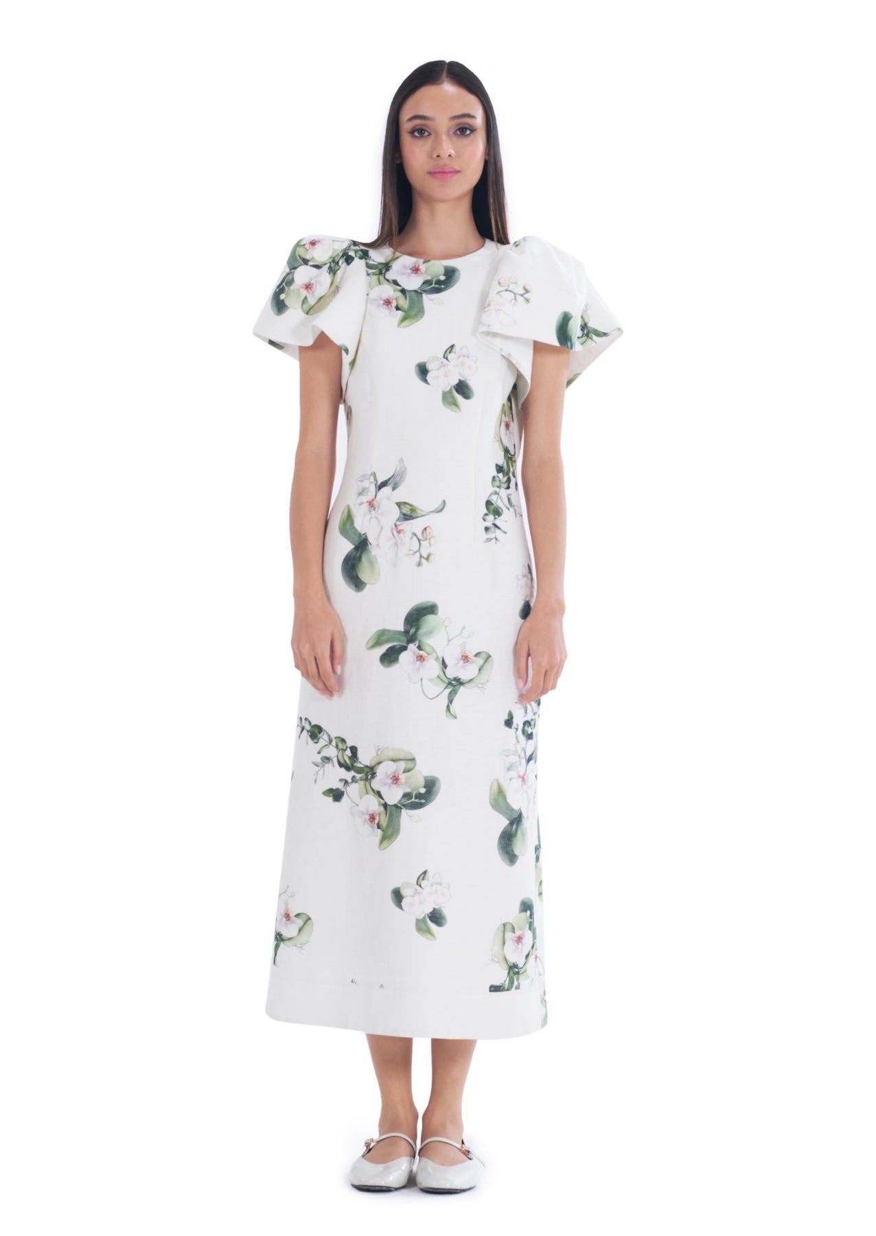 Featuring sculptural gathered sleeves, this maxi dress creates a beautifully dynamic silhouette. The delicate orchid print adds a touch of elegance and femininity, making it the perfect piece for a statement look with graceful charm.