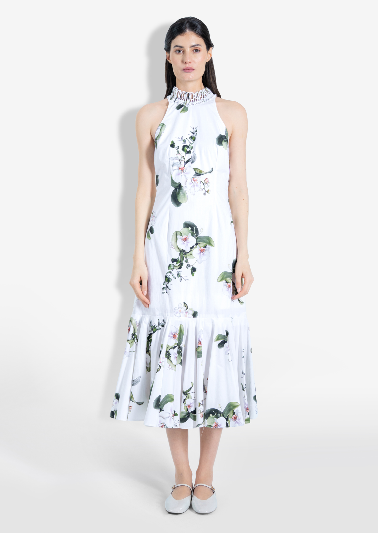 Featuring our signature orchid print, this midi-length dress is defined by its distinctive loop collar with intricate handmade loops—an elegant nod to artisanal detail and timeless style.