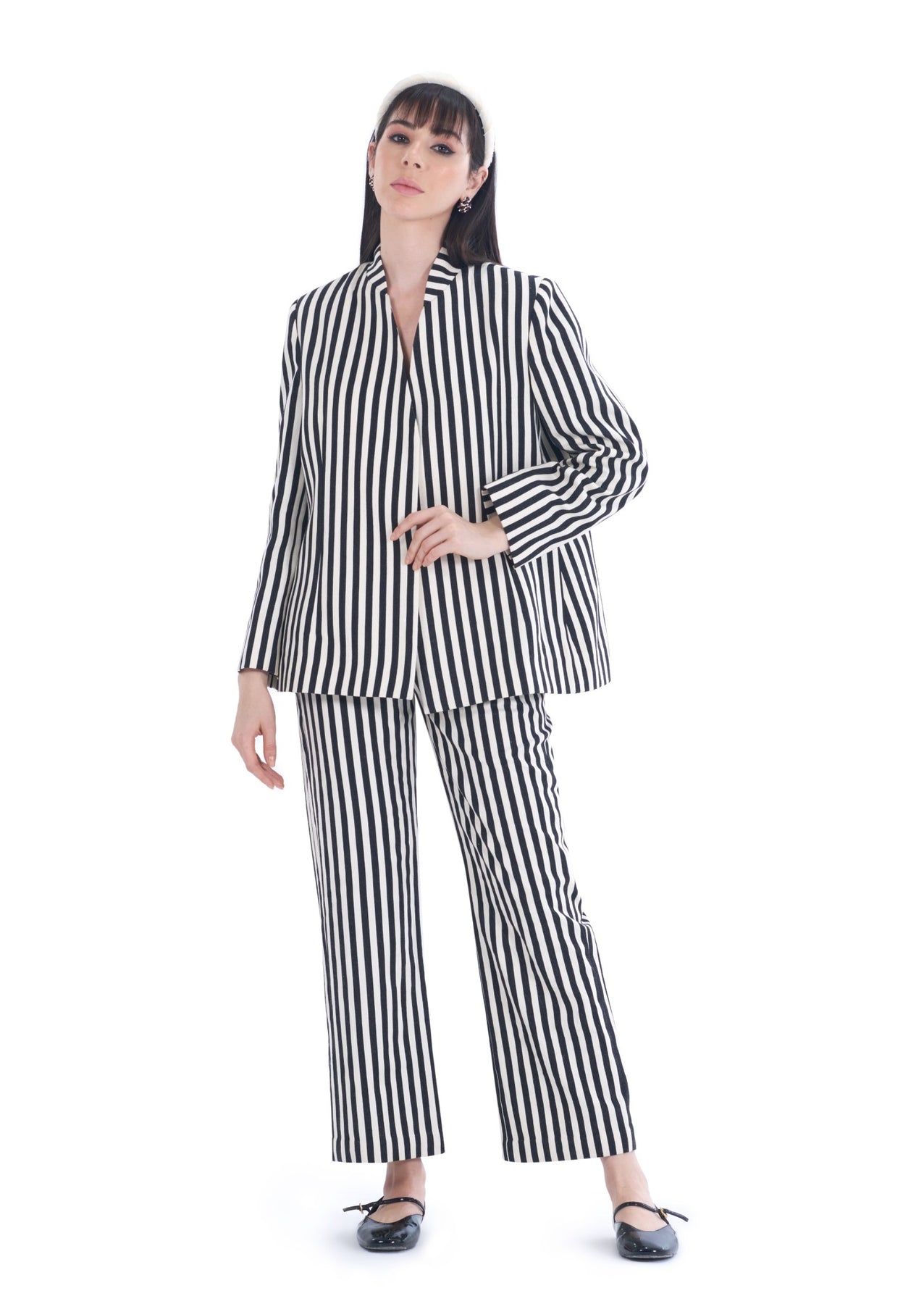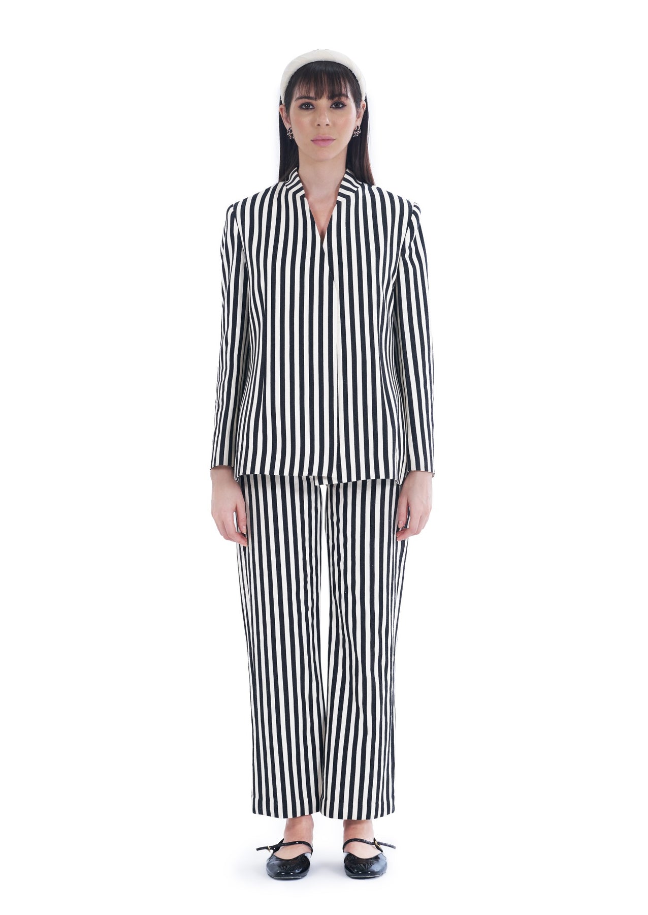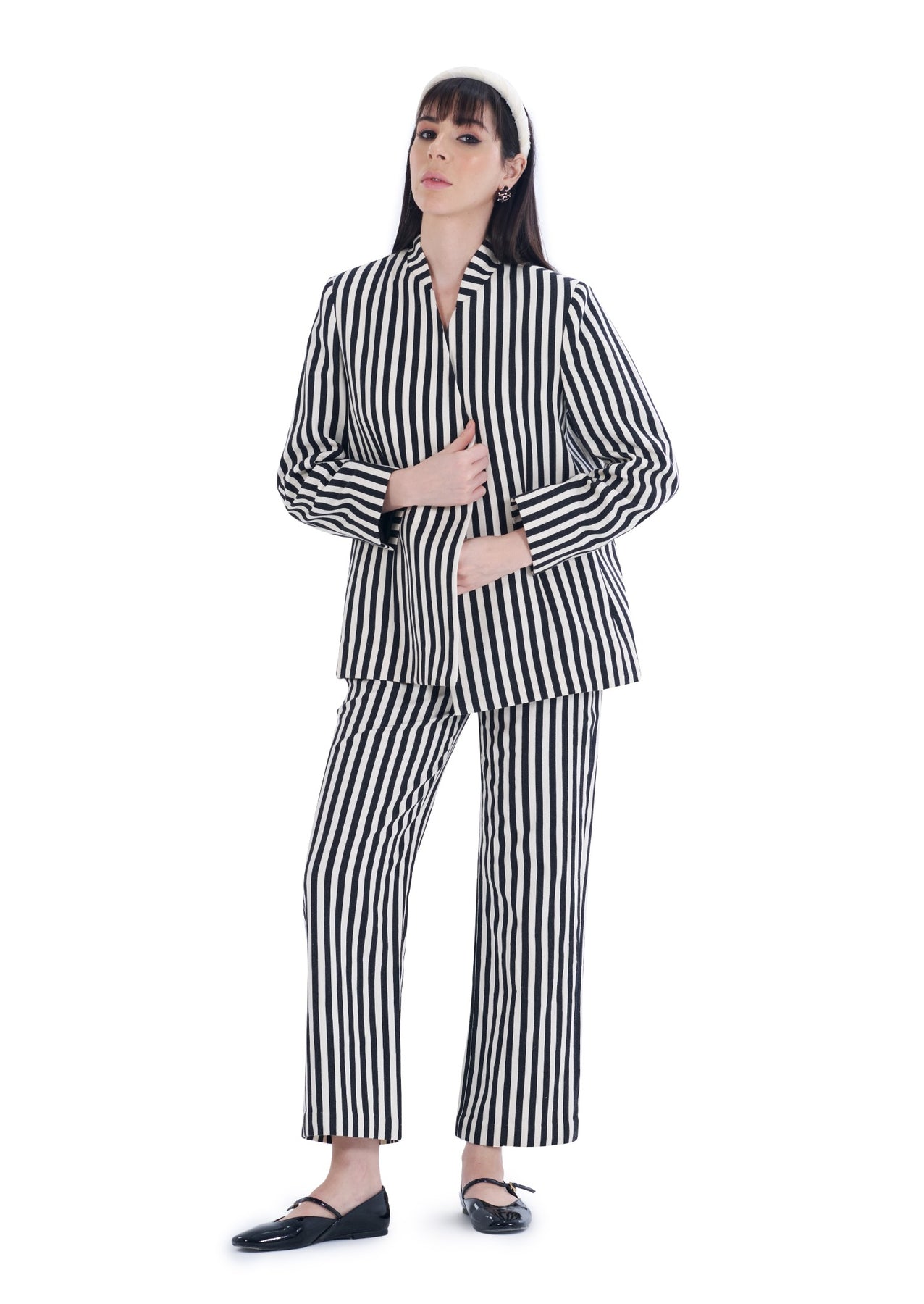 This hand-woven denim stripes pant suit combines effortless style with unique craftsmanship. Featuring a relaxed fit, it offers comfort and ease without sacrificing elegance. The striking striped pattern and soft denim fabric create a modern, laid-back look, while the tailored details maintain a sharp silhouette. Perfect for both casual days and stylish evening events.
