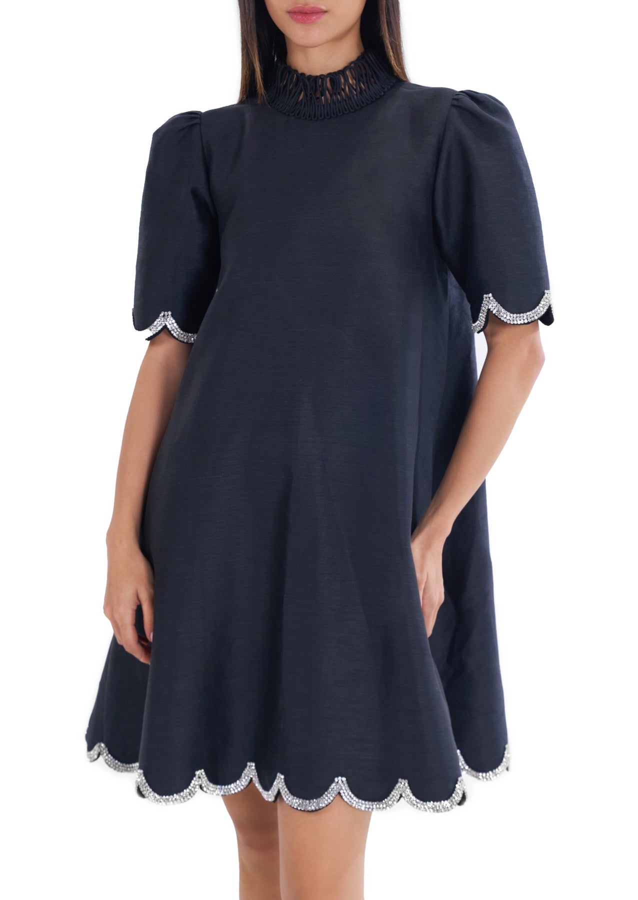 A flattering A-line silhouette with scalloping detail at hem and delicate hand - embroidery, adding an elegant, feminine touch. The thoughtful details combine whimsy and sophistication, creating a refined look.